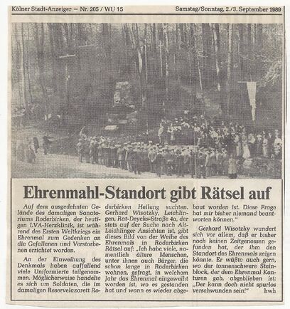[[Datei:EhrenmalStandort 02091989-001.jpg|links|mini|434x434px|Kölner Stadtanzeiger 1989; Gerhard Wisotzky über den rätselhaften (ehemaligen) Standort eines Ehrenmals, Sammlung: Josef Herweg]] | [[Datei:EhrenmalStandort 02091989-001.jpg|links|mini|434x434px|Kölner Stadtanzeiger 1989; Gerhard Wisotzky über den rätselhaften (ehemaligen) Standort eines Ehrenmals, Sammlung: Josef Herweg]] | ||
